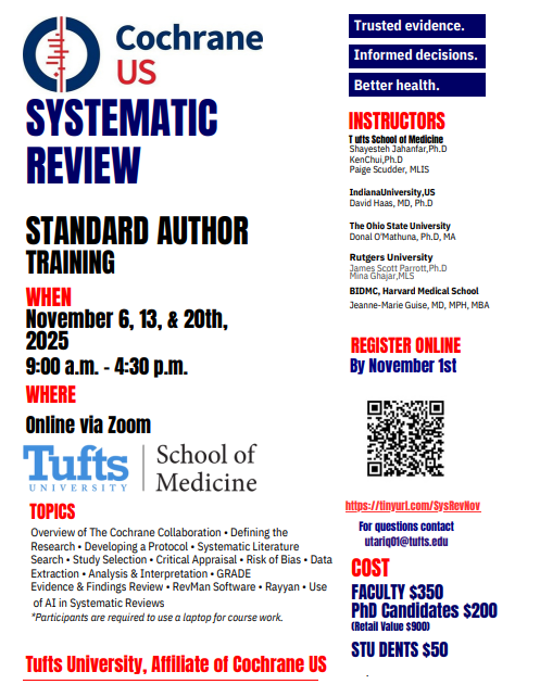 Tufts University, Affiliate of Cochrane US, is offering its Standard Author Systematic Review Training this November. This comprehensive program equips participants with the essential skills needed to design, conduct, and interpret systematic reviews following Cochrane standards.